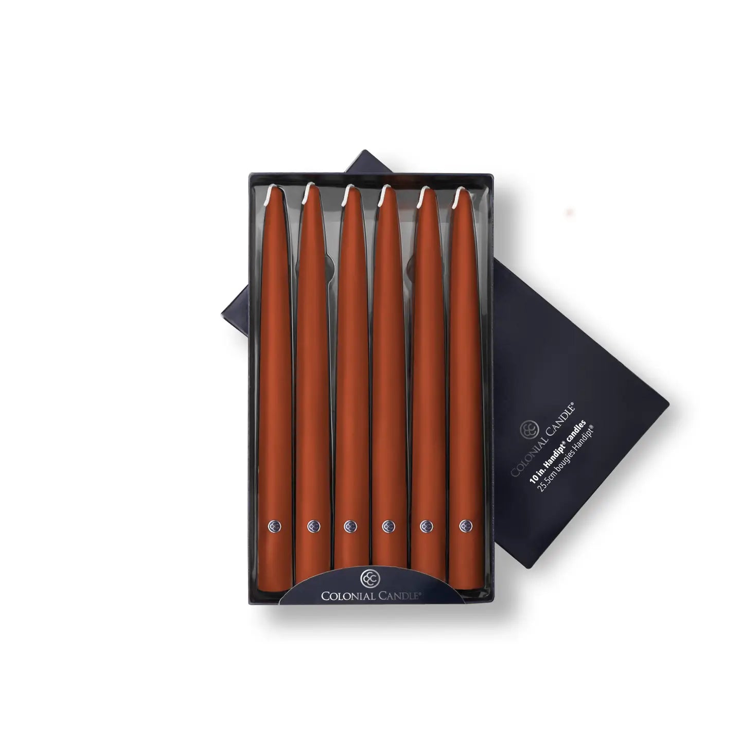 A warm and cozy color, our Amber taper candles bring a glow to your home decor. These ten-inch candles are hand dipped, virtually drip free, and have a burn time of up to eight hours each.