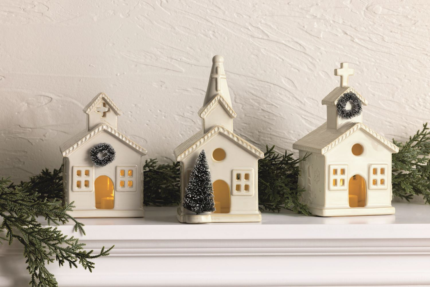 Milk glazed stoneware church sitter features bottle brush wreath or tree detail and pierced openings for light to shine through. Place over flameless tea light to light it up