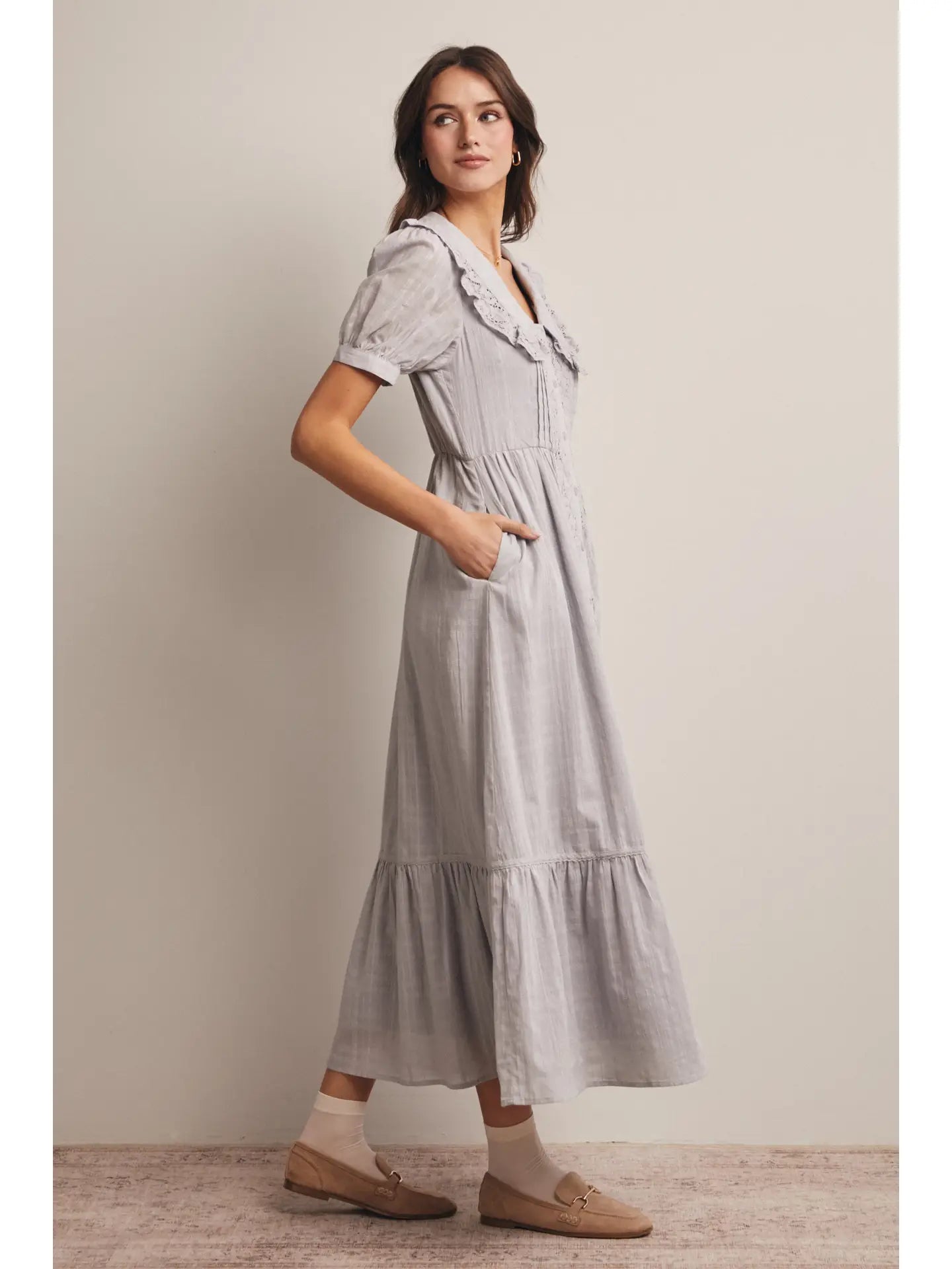 Timeless, feminine, and subtly Boho, this embroidered Dress blends soft structure with romantic detailing-perfect for styling with flats or boots for an effortlessly refined everyday look.