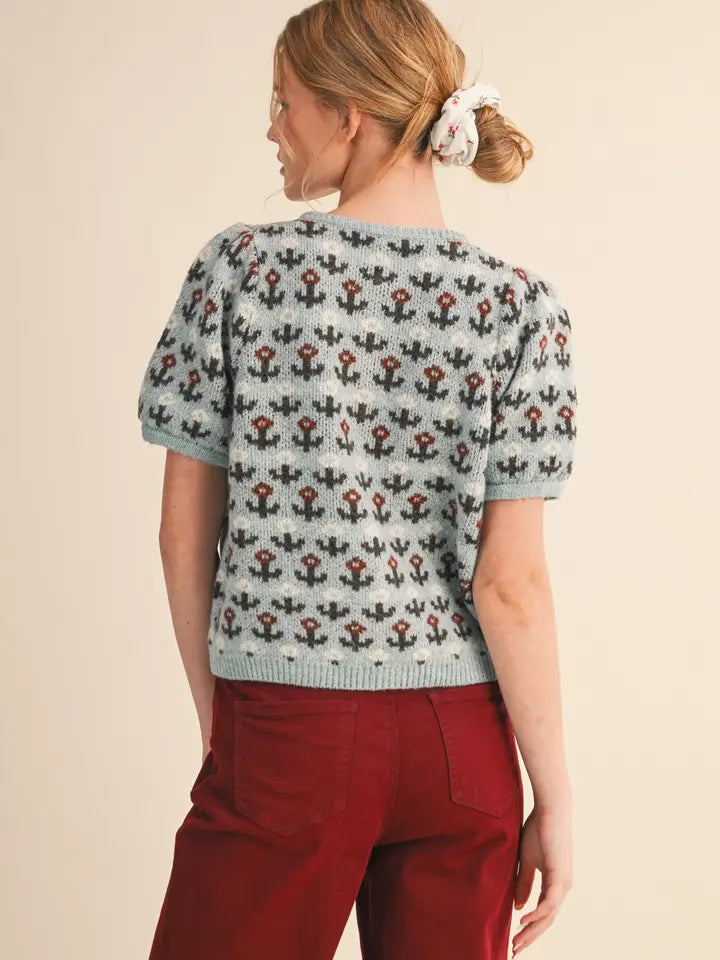 + Floral knit short puff sleeve sweater cardigan + Ribbed round neck + Short puff sleeves + Button down placket + Relaxed fit + Ribbed hem + All-over floral knit design + Model is 5' 7" 30-24-34.5 and wears a S
