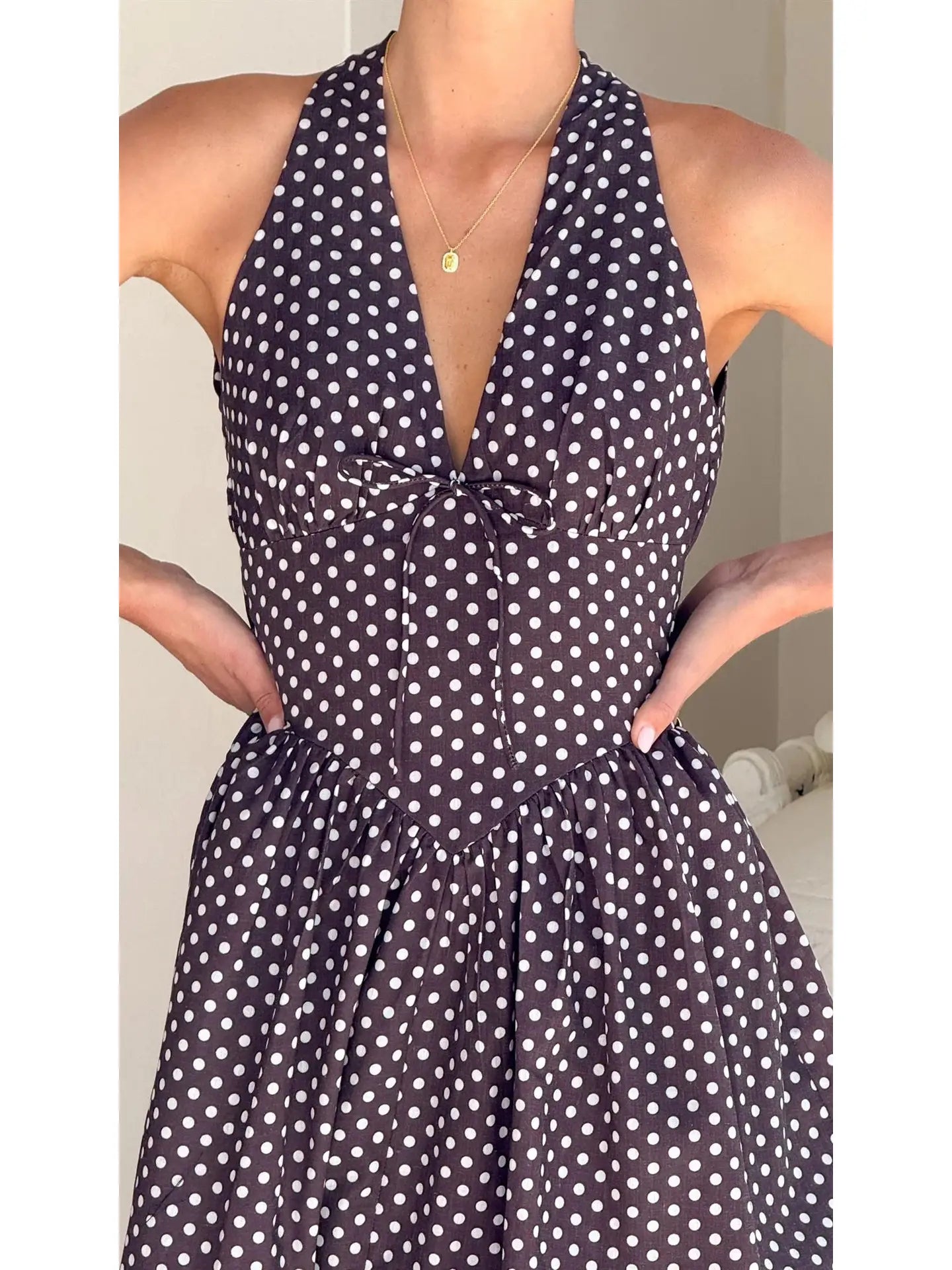 The dress is a sleeveless, floor-length garment with a halter neckline and a deep V-shaped front. It features a dark brown base color with a pattern of large white polka dots. The bodice has a fitted design with button detailing down the front, while the skirt flares out into a full, flowing silhouette with gathered pleats at the waist.
