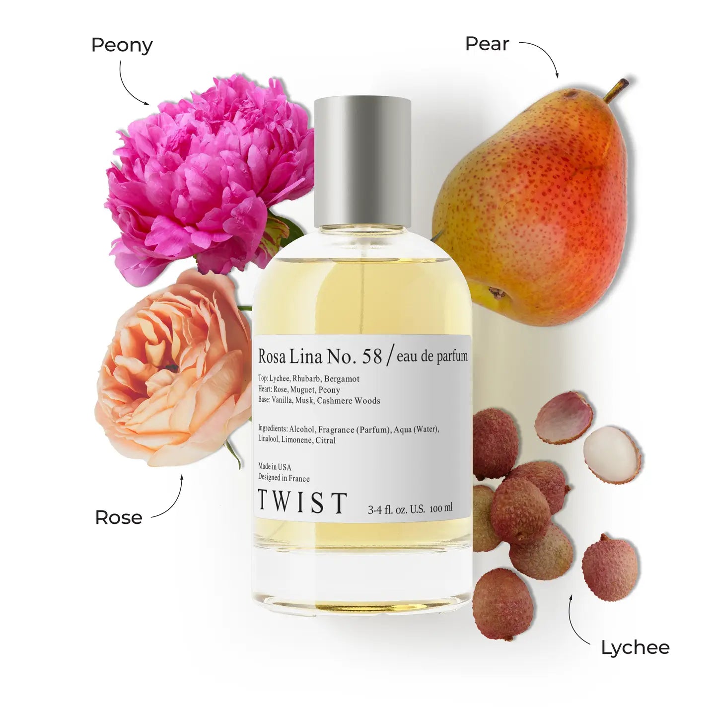 Top Notes: Lychee, Rhubarb, Bergamot Heart Notes: Rose, Muguet, Peony Bottom Notes: Vanilla, Musk, Cashmere Woods